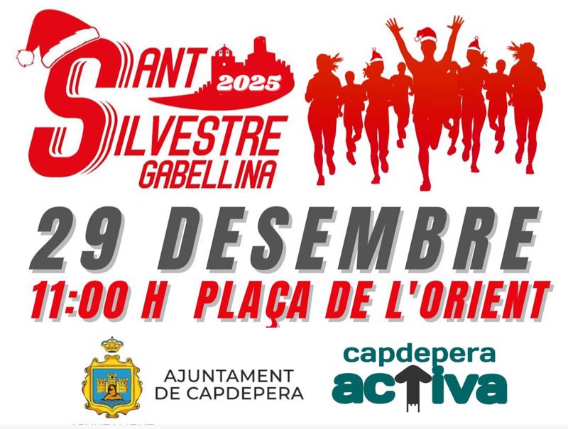 SANT SILVESTRE GABELLINA 2025 DILLUNS 29 DE DESEMBRE a les 11:00 h PLAÇA DE L’ORIENTVeniu amb les vostres millors gales per la cursa.Hi haurà premi per a la millor disfressa.Xocolatada i ensaïmada per a totes les persones participants. Altres articles L’Alei-alei 2025 comptarà amb 150 manats de faies 23 de novembre de 2025 Vídeo del concert de Santa Cecília 2025 26 de novembre de 2025 Encanto, el triomf del teatre familiar 20 de novembre de 2025 El Centre Jove de Capdepera participa en la formació de corresponsals d’IBJOVE 21 de novembre de 2025 Un café o un cafè? 27 de novembre de 2025 Guanyadors de l’edició de 2025 del concurs de microrelats 25N 7 de desembre de 2025